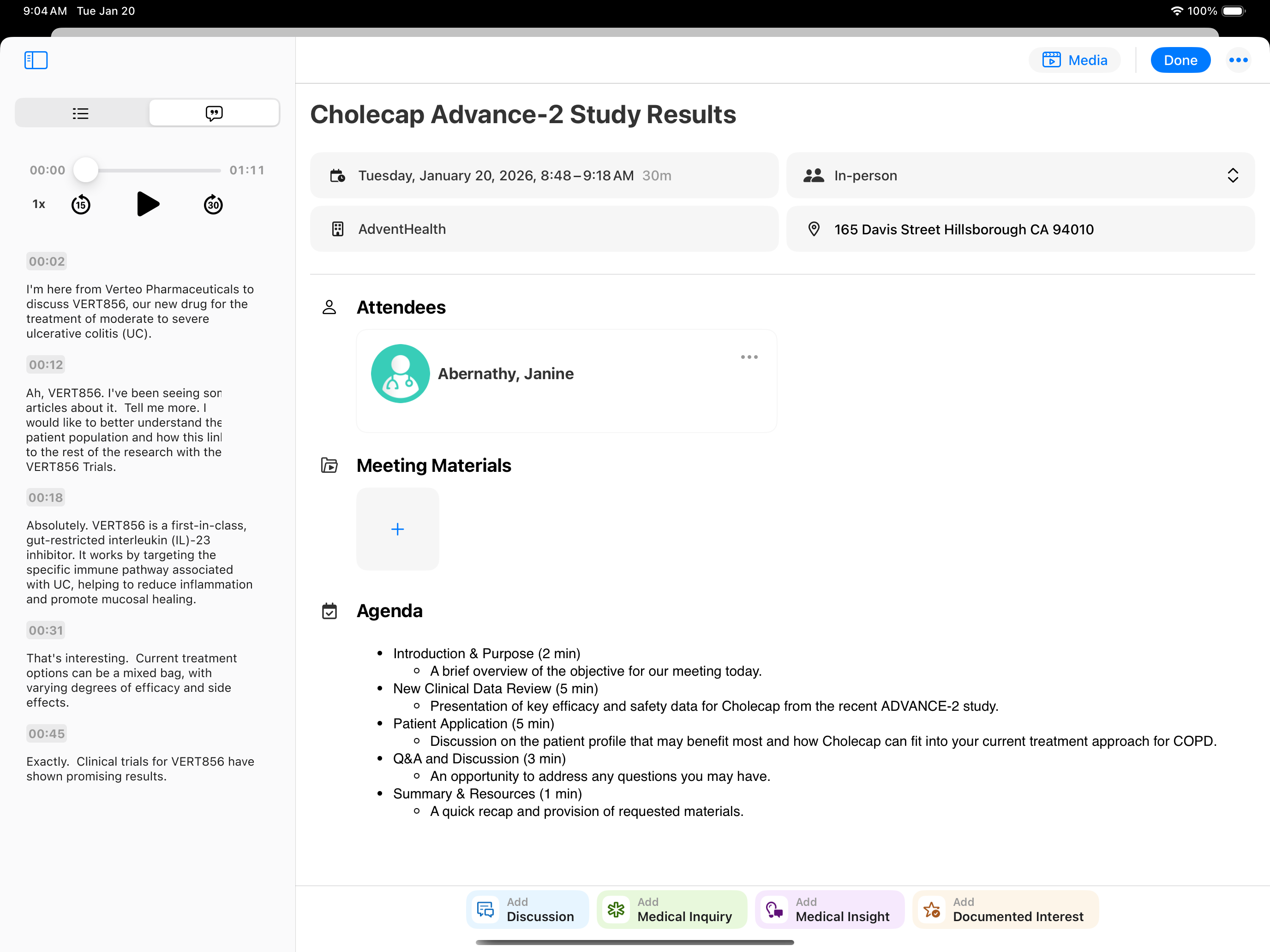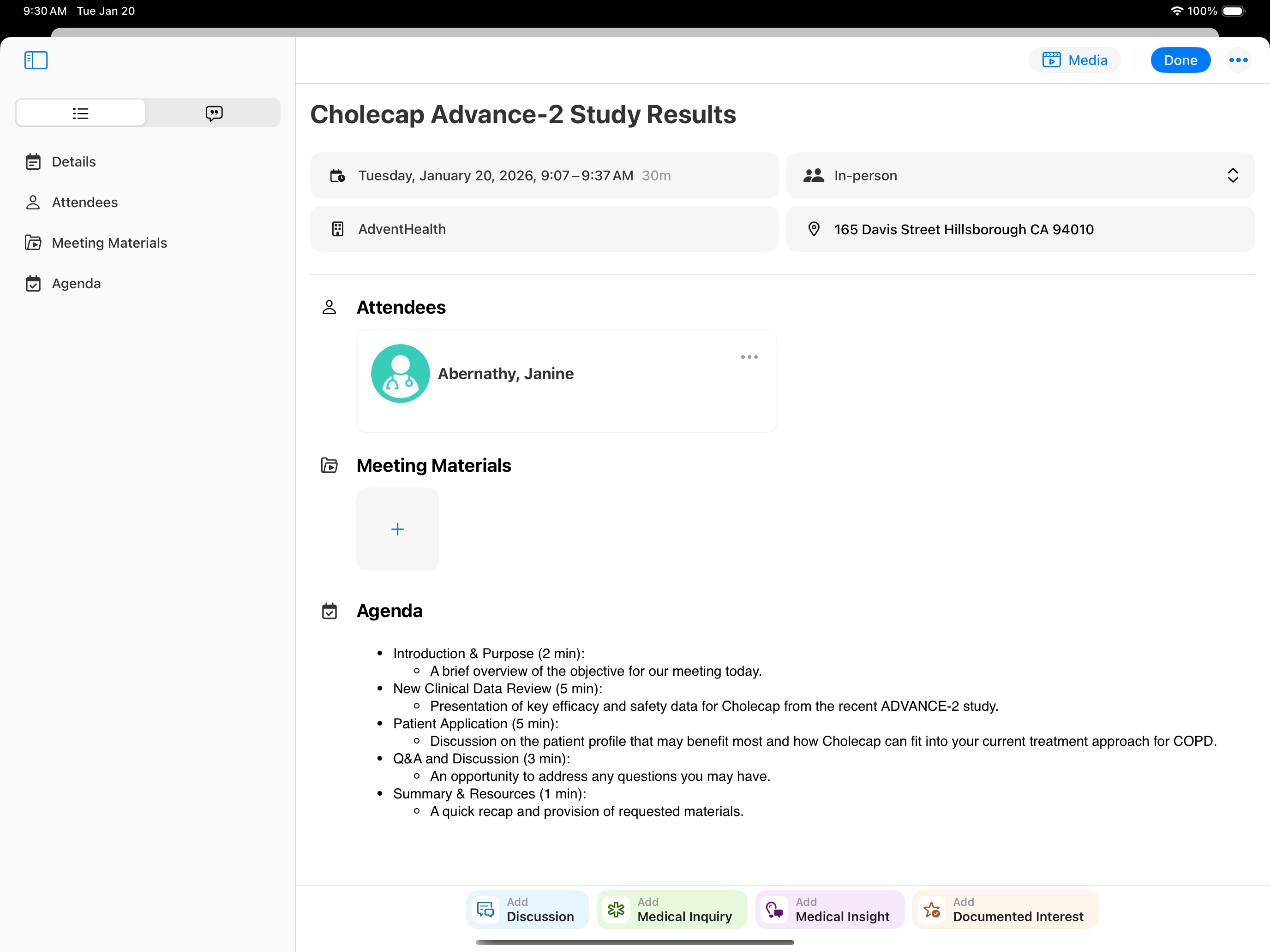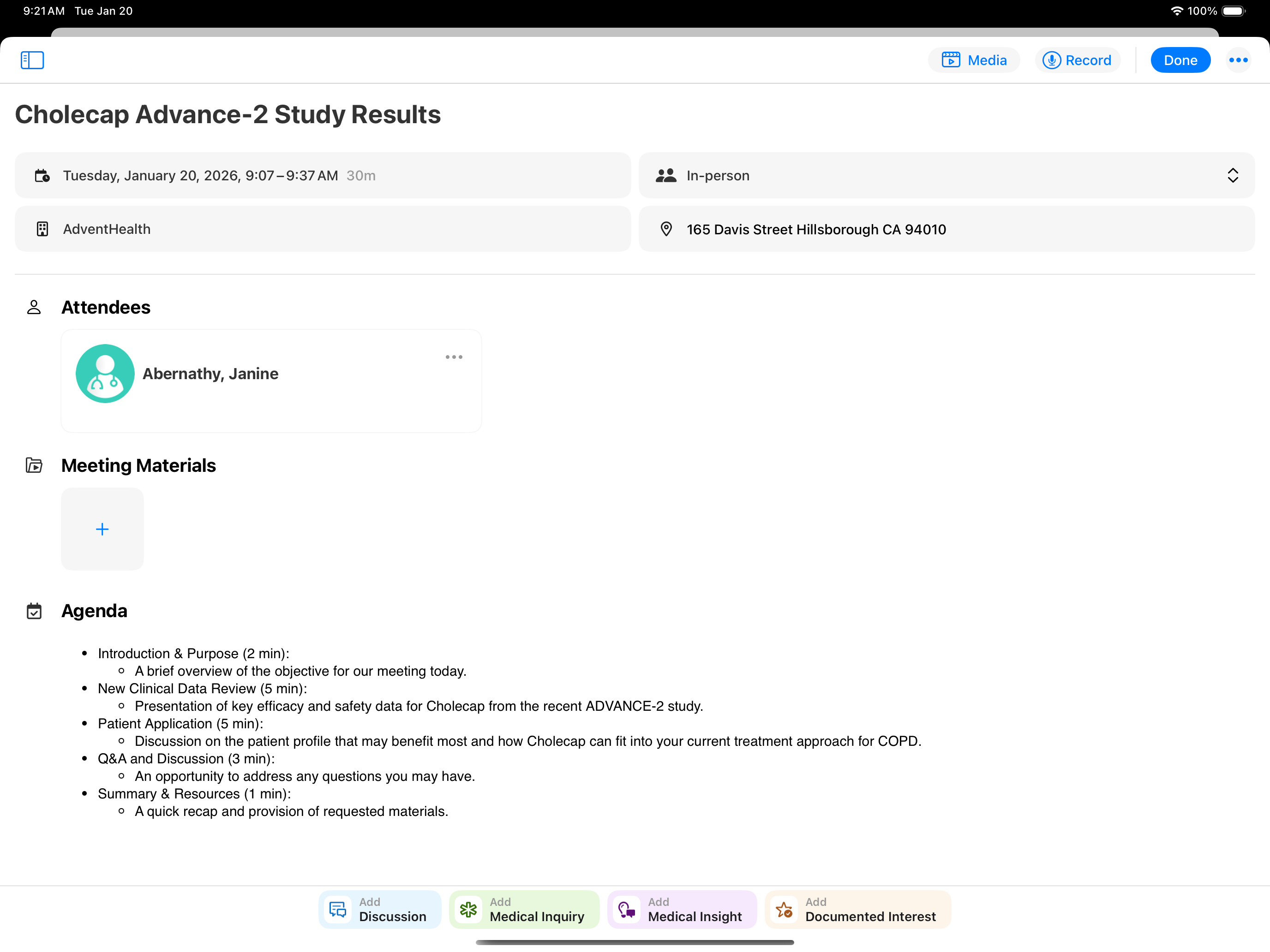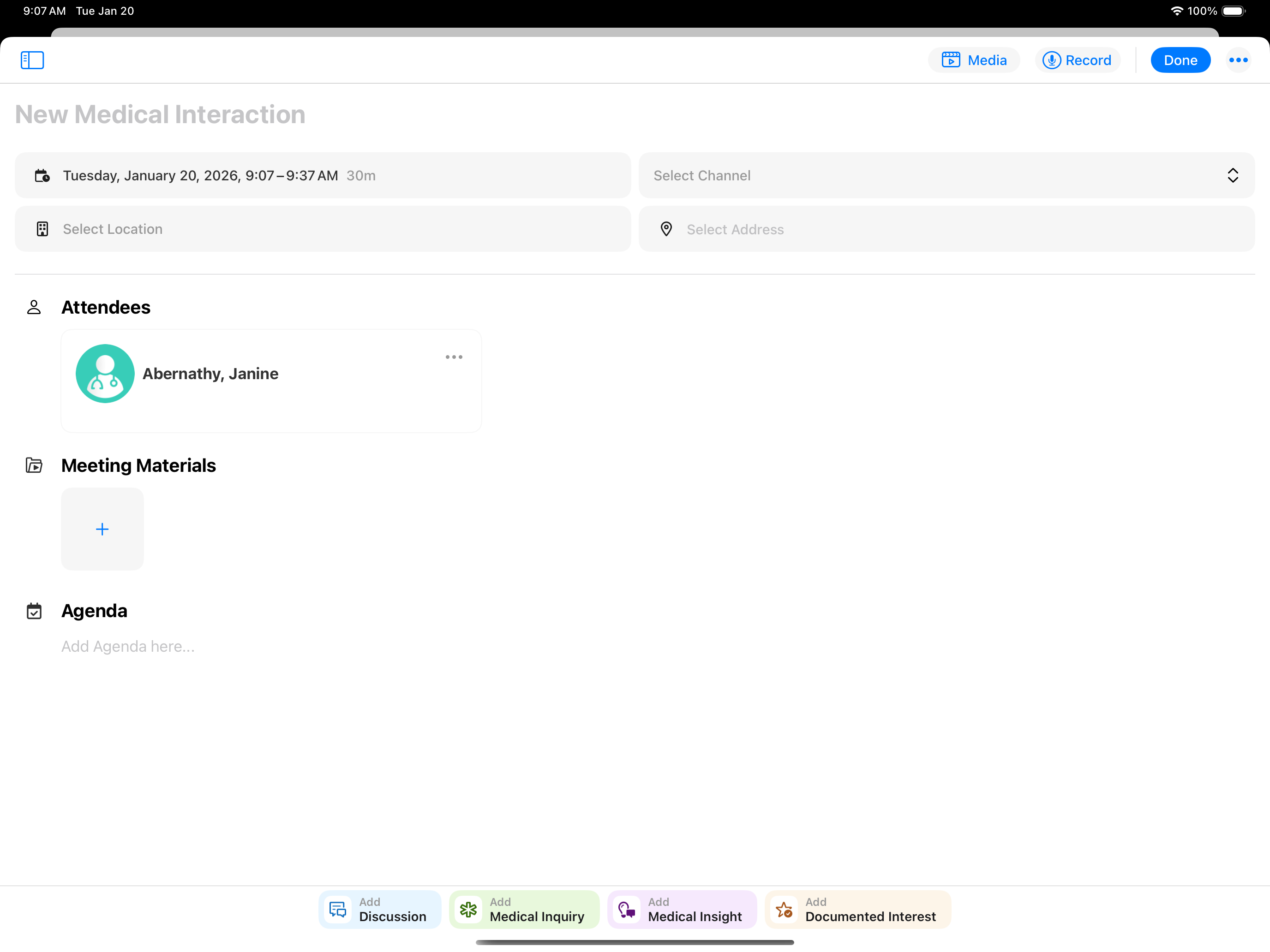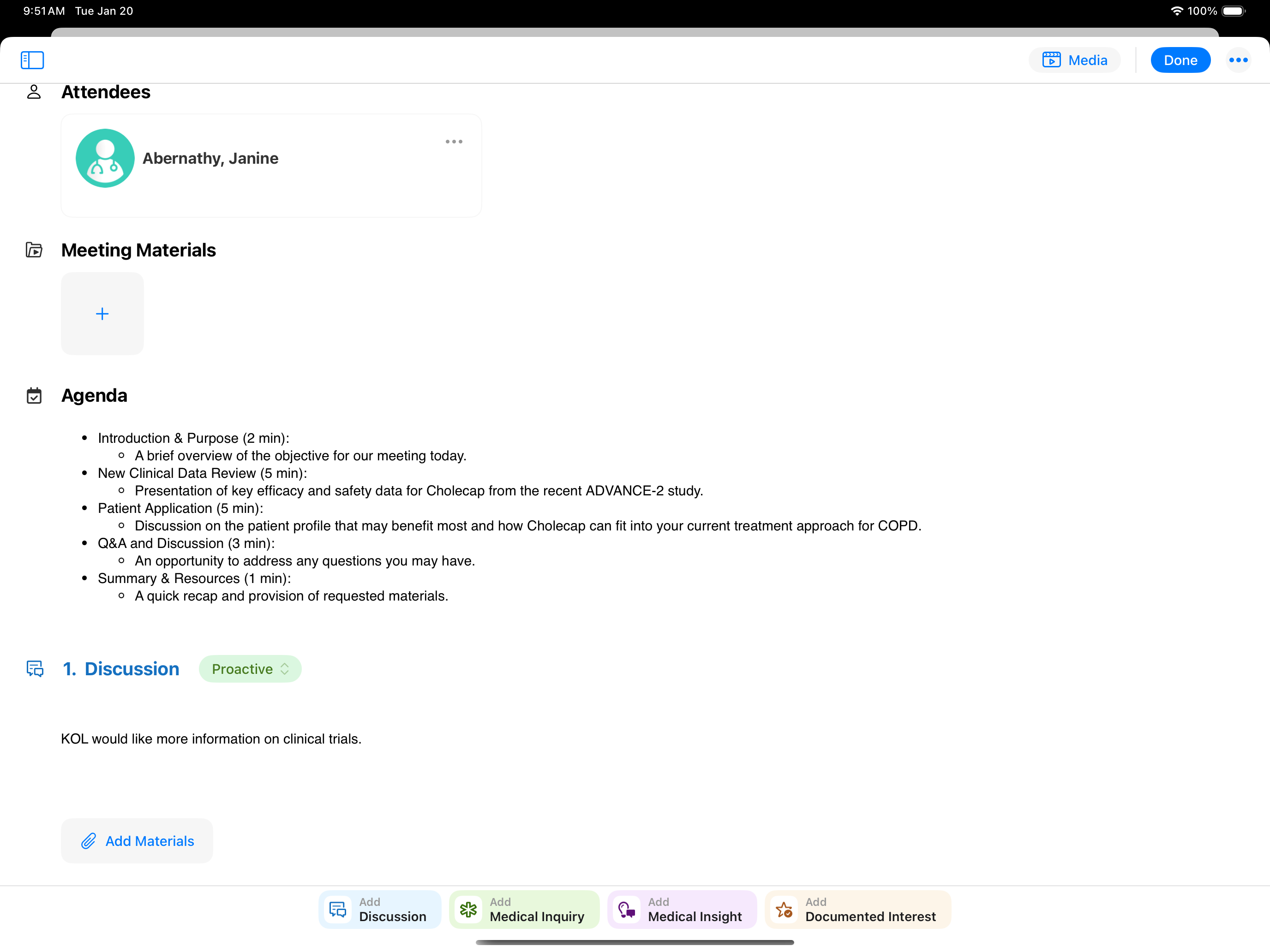 Medical Interactions provides medical users with a comprehensive method of planning and tracking their interactions with medical professionals, leading to stronger relationships and better communication of product information. The Medical Interaction user interface (UI) is designed to be dynamic, allowing users to easily take notes and only add the sections they need. To provide continuity of account medical-related information, users can also create Discussions, Medical Inquiries, Key Medical Insights, and Documented Interests directly from the Medical Interaction report.